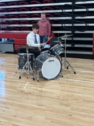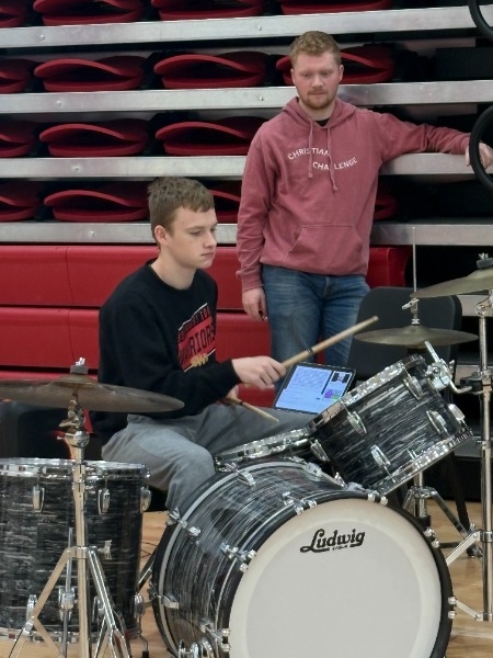 As part of preparation for High School Jazz Band’s Celebration performance, Christian Harris, Sidney graduate, and past UNL drumline member, joins HS percussionists to teach them some ideas on the trapset. He’s been working with HS percussionists for the last two weeks on drumline as well.